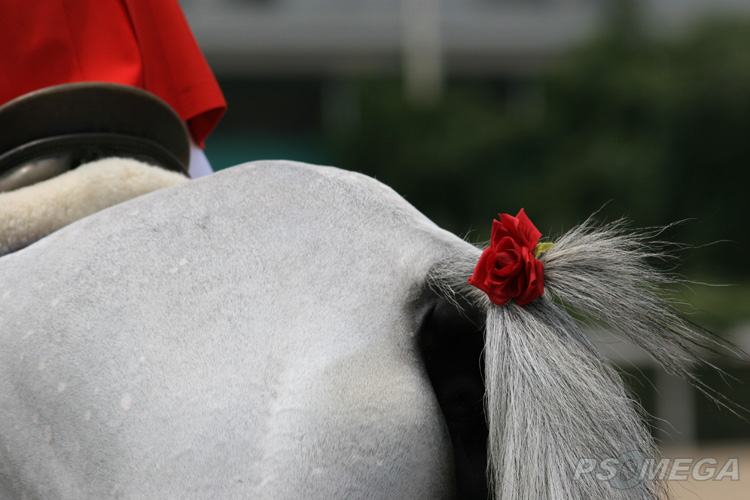 ![]() マコーリーの尻尾に花 誘導馬マコーリーの尻尾に、バラの花一輪・・・意味はよくわからない。 園田競馬場 '05/08/17 |