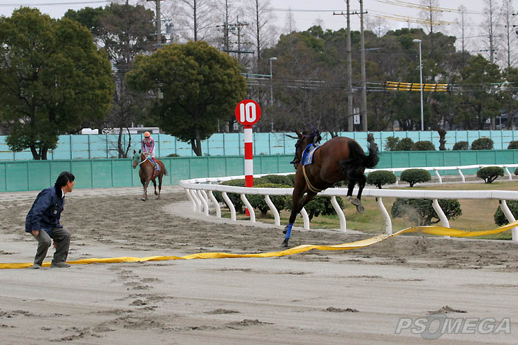 ![]() 放馬した馬がジャンプ 係員が張った帯を飛び越して走る 名古屋競馬場 '06/03/21 |