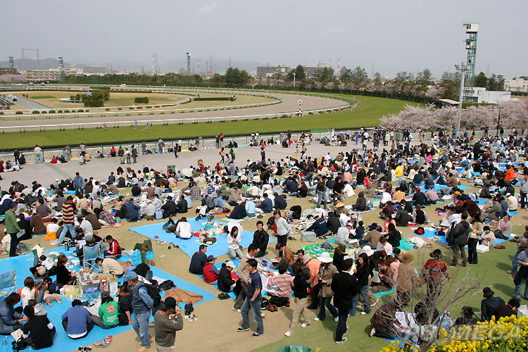![]() たくさんの観衆 桜満開、ポカポカ陽気、GIレースということで、芝生にはシートを敷いた観客でいっぱい 阪神競馬場 '06/04/09 |