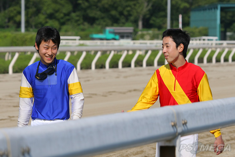 ![]() 表彰式を終えて ヤングジョッキーズステージの表彰式を終えて馬場を歩く茶畑騎手(左)と伊藤騎手(右)。 園田競馬場 '06/05/04 |