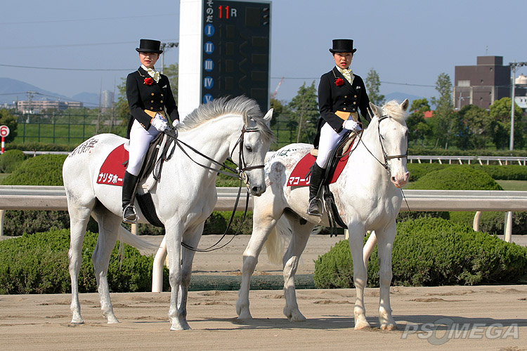 ![]() 第42回兵庫大賞典 誘導馬2頭、お尻に「兵庫大賞典」と書いてある。 園田競馬場 '06/05/05 |
