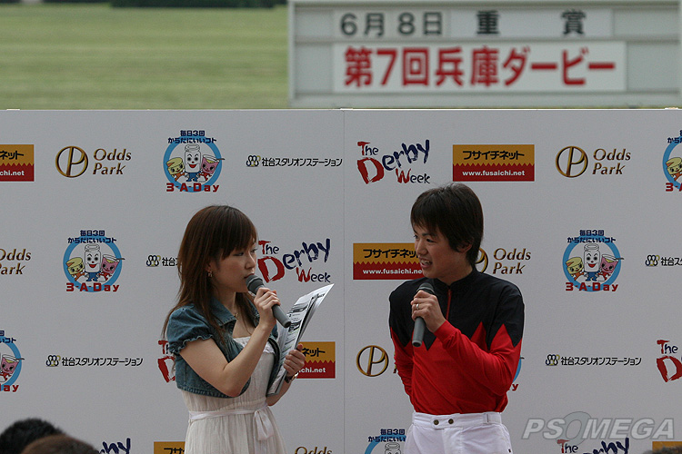 ![]() 第7回兵庫ダービー ダービーウィークの企画として、第6レース終了後に小谷騎手のトークイベントが開かれた。 当初タニノミモザに騎乗する予定だった松本幸祐騎手がトークショーに参加する予定だったが、 急病で乗り変わった小谷騎手に変更された。 園田競馬場 '06/06/08 |