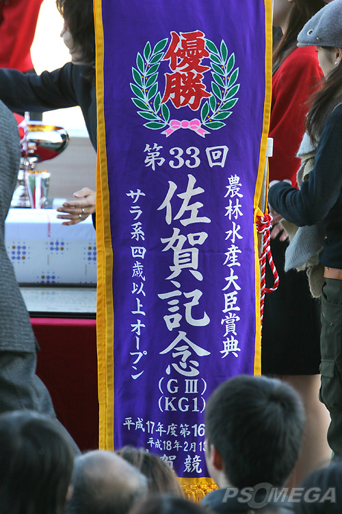 ![]() 第33回佐賀記念 表彰式で飾られていたレイ。スタンド前での記念撮影もなく、後藤騎手も早々に帰ってしまって寂しい表彰式だった。 佐賀競馬場 '06/02/13 |