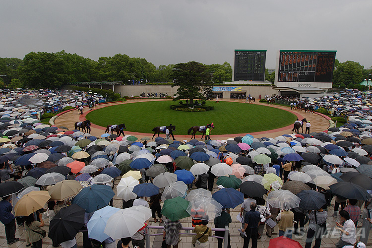 ![]() 第47回宝塚記念 あいにくの雨、傘のせいでパドックを回る馬が見えない人多数。 京都競馬場 '06/06/25 |