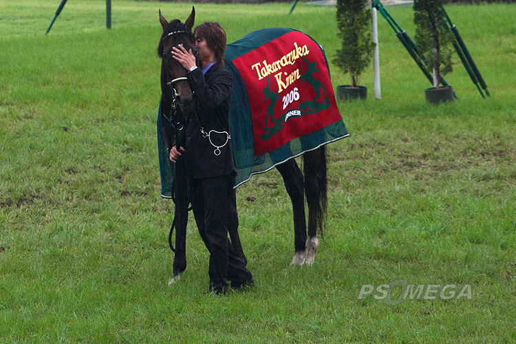 ![]() 第47回宝塚記念 表彰式の間、馬服を着て馬場を回るディープインパクト 京都競馬場 '06/06/25 |