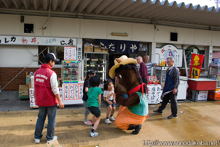 ![]() ワールド牧場のキャラクター 控え室に戻る所で子供たちにからかわれる「ワールド牧場」のキャラクターの着ぐるみ。 園田競馬場 '07/04/30 |