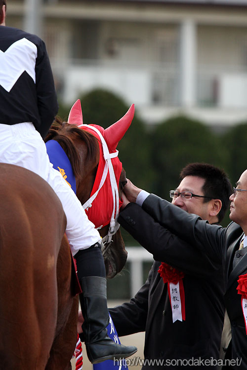 ![]() 第37回園田ジュニアカップ タマモリターンをねぎらう調教師と馬主 園田競馬場 '08/12/31 |