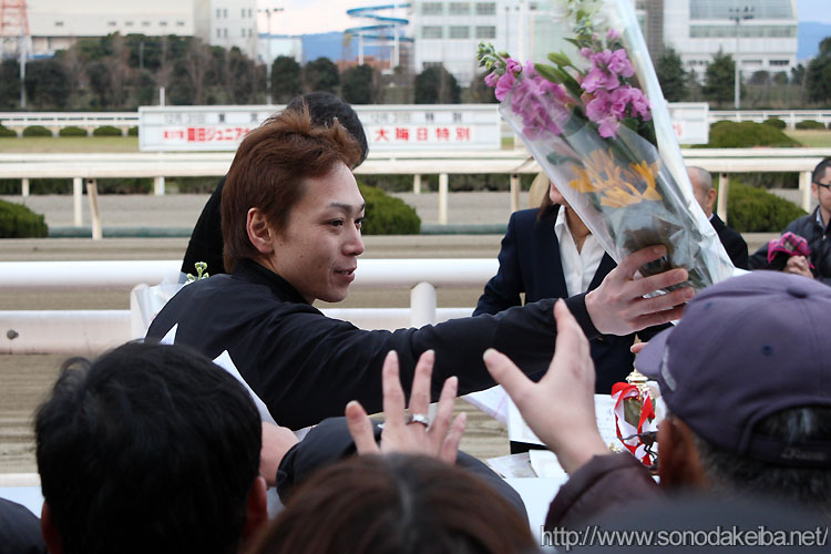 ![]() 第37回園田ジュニアカップ 花束を配る板野騎手 園田競馬場 '08/12/31 |