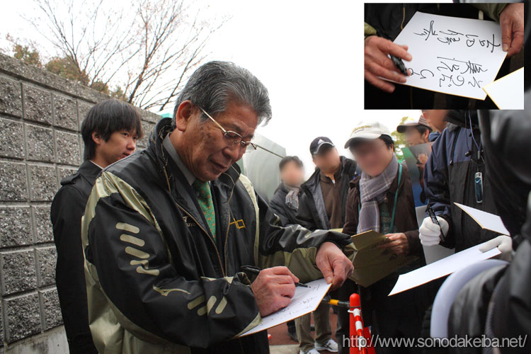 ![]() サインを書く吉田アナ 小牧太騎手トークショーの合間、吉田アナのサインを求めるファン。 園田競馬場 '09/01/02 |