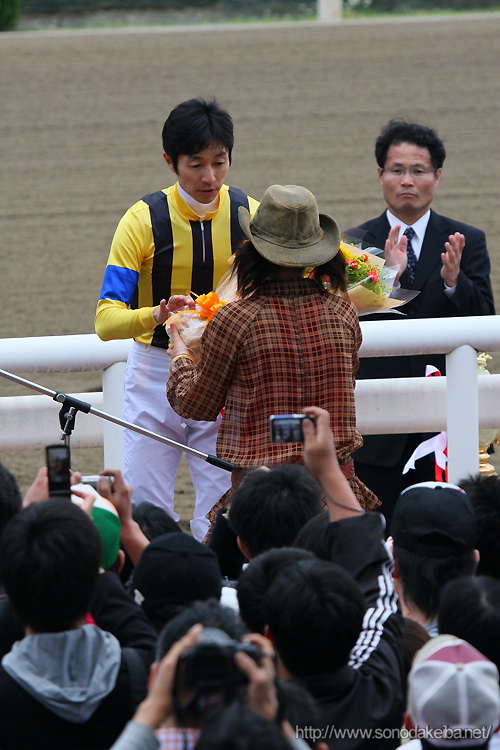 ![]() 第10回兵庫チャンピオンシップ 園田・姫路競馬イメージキャラクターの鹿谷弥生さんが花束贈呈。 園田競馬場 '09/05/06 |
