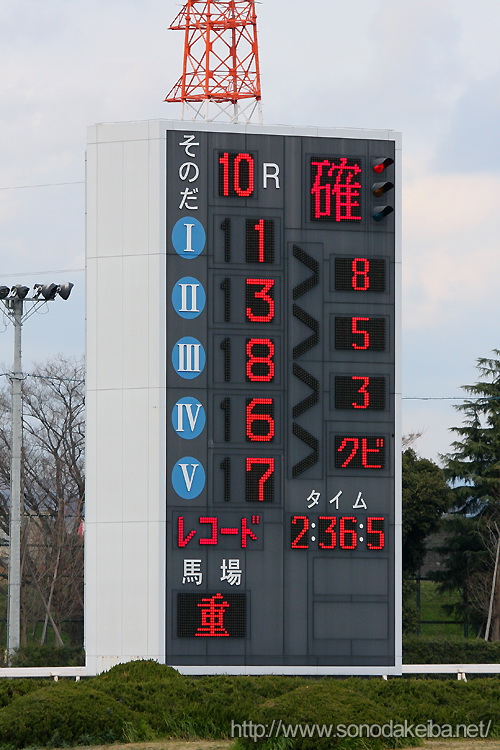 ![]() 第46回六甲盃 レースタイムは2:36:5、8馬身差。2,400mのレコードタイムで勝利。 園田競馬場 '09/03/04 |
